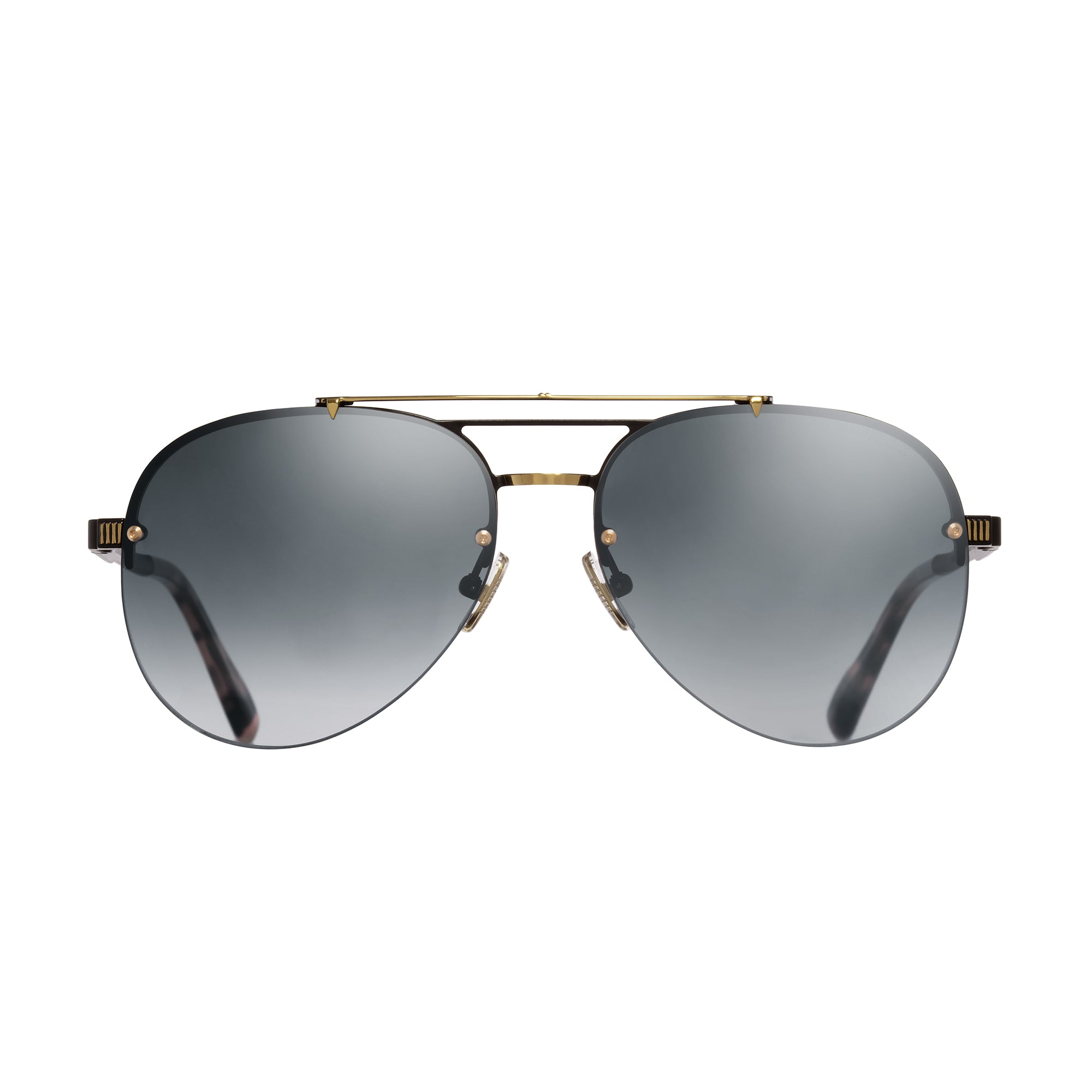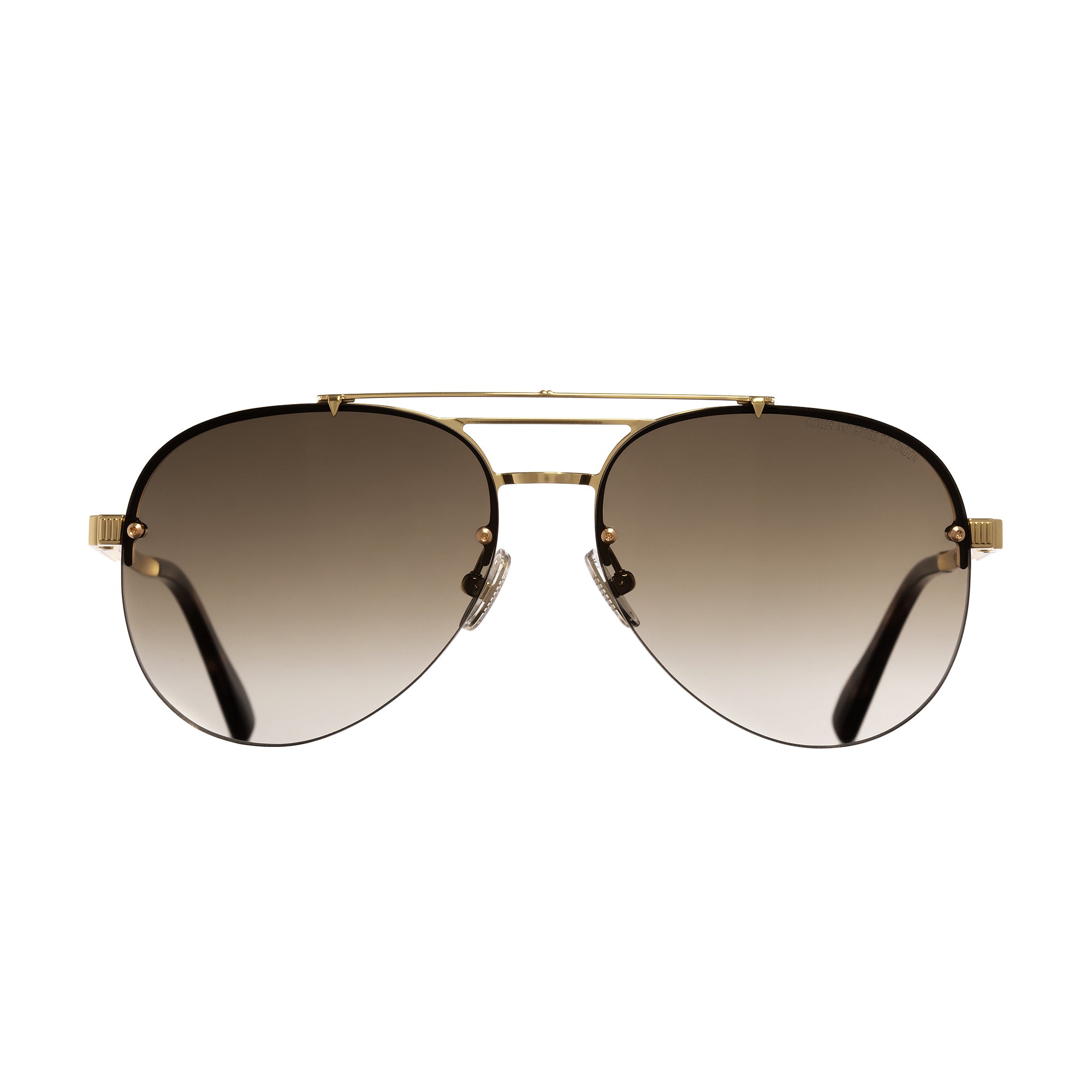 A luxurious. semi-rimless aviator sunglass made from Japanese titanium combined with fine Italian acetate temple tips. A true expression of collaboration between the finest factories on each continent. Unique upper metal bar design on the frontal with weight saving construction. Gold plated to 5 microns enhanced by two-tone gold and palladium. One of our flagship sunglasses. engineered for comfort and performance.Customised hypoallergenic branded nosepads. vizanni screw design exclusive to Cutler and Gross. Essilor and Zeiss AR coated performance lenses. fixed with hex screws for security and longevity.